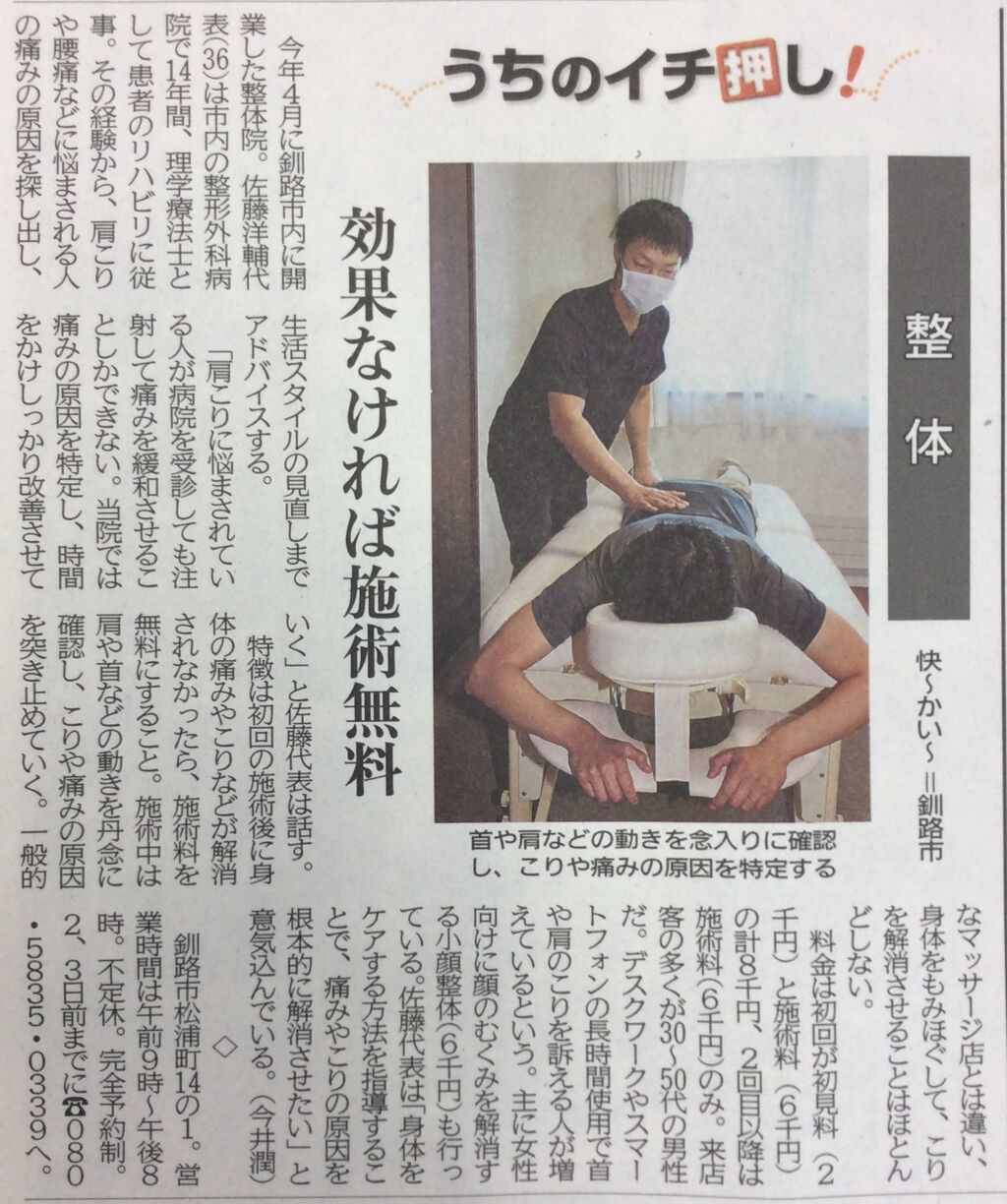 8月7日(金)の北海道新聞に整体院 快~かい~ さんが紹介されました!!